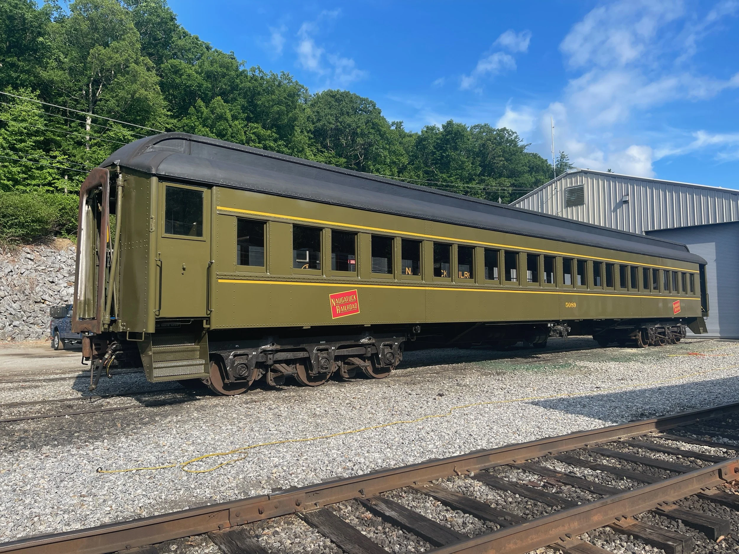 Heavyweight coach built 1927 by National Steel Car (NSC). This century-old passenger car seats 50, has windows that open, and is equipped with its own furnace to provide heat in cold weather. A notable characteristic of the CN coaches is/are the six-wheel trucks for a smoother ride. Built for mainline service as 5089 and later used for commuter service as 4992 from the late 1960s to the early 1990s. Sold 1991 to private owner, donated to RMNE 1997. Used as coach 4992 until 2021, when it was rebuilt to a lounge car by RMNE and renumbered to 5089 in 2022. Lettered for Naugatuck Railroad.